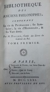 DACIER Bibliothèque des anciens philosophes, 1771. 9 vol. in 12, veau blond, dos à nerfs et dorés, reliure époque. - SAVERIEN Histoire des philosophes modernes, Paris, 1771-1773. 8 vol. in 12, veau blond époque.