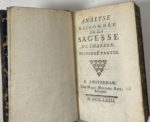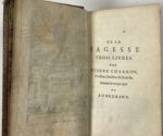 LA ROCHE DU MAINE (Mquis de Luchet). Analyse raisonnée de la sagesse de Charron. Amsterdam Rey, 1763. In 12, veau époque, dos orné et doré. E.O.2 parties en un vol.- De la Sagesse. Leyde, Elsevier, s. d.. In 16 maroquin rouge du XVIIème, dos...