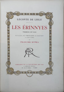 (Cuzin). 31 eaux- fortes de Edmond Morin. Un des 100 exemplaires numérotés nominatifs, celui- ci porte le nom de Quentin- Bauchart..- LECONTE DE LISLE. Les Erinnyes. Romagnol, 1908. In - 8 demi-bas. fauve à coins usagée. Compositions gravées par François Kupka. Un des 190 exemplaires numérotés sur Arches. Ens. 2 ouvr.