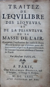 PASCAL (Bl.). Traitez de l'équilibre des liqueurs. Paris, Desprez, 1663. In- 12 bas. brune granitée de l'époque un peu usagée (restauration au dos). Edition originale complète de ses 2 planches gravées dépliantes. Ex- libris gravé ancien.