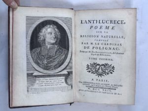 POLIGNAC (M.de). L'anti -Lucrèce… traduit par de BOUGAINVILLE. Paris, Guérin, 1749. 2 vol. in- 8 veau époque un peu usagé, dos à nerfs ornés et dor. Edition originale. Portrait gravé par Rigaud, bandeaux et culs de lampe par Eisen....