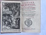 Exemplaire sur papier vergé.- SATYRE MENIPPEE de la vertu du Catholicon d'Espagne. Ratisbonne, les héritiers de M. Kerner, 1726. 3 vol. in- 8 demi- veau époque usagé, dos ornés et dor. Figures gravées. Ens. 2 ouvr. en 5 vol.
