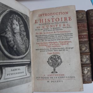 PUFENDORF. Introduction à l'histoire générale et politique de l'Univers. Amsterdam, 1722. 7 vol. in 12, veau brun époque (usagé). Planches (accident à une carte). - DENIS. Buenos Ayres et le Paraguay. Paris, Nepveu, 1823. 2 vol in 16 veau fauve...