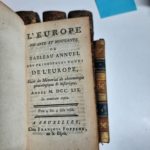 époque (usagé avec manque sur les dos). Edition originale. 18 gravures en couleurs dont 6 sur double page. - L'Europe vivante et mourante, Bruxelles, Foppens, 1759. in 16 veau brun époque (usagé), dos doré. - CHARLEVOIE. Histoire de l'établissement des progrès et de la décadence du christianisme dans l'Empire du Japon. Paris, s.d.. 2 vol.in 8 veau époque usagé. -BUFFIER (Cl.). Histoire de l'origine du Royaume de Sicile et de Naples. Paris, Anisson, 1701. 2 parties en un vol. In 8 veau fauve époque dos orné. Edition originale.