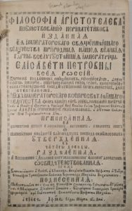 chaque page est encadrée d'une bordure ornementale. Ce manuel académique de philosophie aristotelicienne établie par le hieromoine Mikhäel Kozatchinski, préfet et professeur de philosophie de Kiev est composé d'un titre, de 56 ff et illustrée d'une planche gravée repliée. La dédicace à Elisabeth Petrovna, Impératrice de toutes les Russies, indique la protection impériale, légitimise le retour à une orthodoxie stricte et encourage l'éducation. Le manuel officiel composé de cours destiné à l'enseignement supérieur, s'adressait à l'élite savante, aux étudiants et aux clercs. Il servait également aux examens publics. L'ouvrage à tirage limité, souvent détruit, présente un témoignage philosophique et historique de la Russie Impériale du XVIIIe siècle. Mouillures et salissures.