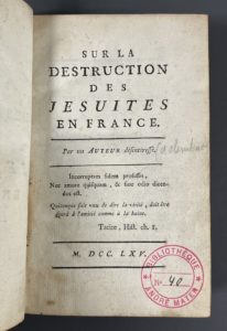 [ALEMBERT (Jean Le Rond d')]. Sur la destruction des jésuites de France. Par un auteur désintéressé. S.l., s.n., 1765. In-12, 233 p. basane mouchetée époque, dos lisse orné à la grotesque, titre doré, tranches rouges (mors sup. fendu)....