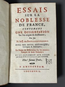 [Reliure aux armes]. BOULAINVILLIERS (C. de). Essais sur la noblesse de France contenans une dissertation sur son origine et abaissement.... avec des notes historiques... un Projet de dissertation sur les premiers François & leurs colonies ; et un...