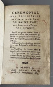 [Picardie. Hagiographie]. CEREMONIAL DES RELIGIEUSES de l'abbaye de N. Dame de Saint Paul prez Beauvais de l'ordre de S. Benoist... A Beauvais, chez E. Vallet, 1683. In-12, 353 p., [2] f. (table), pl., velin ivoire ancien, dos lisse, titre moderne à...