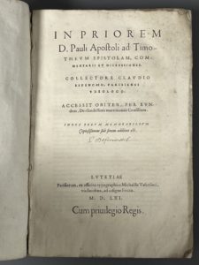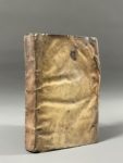 suite, du même] : - In posteriorem D. Pauli apostoli ad Timotheum epistolam commentarius, cum digressionibus XXXIII, seu totidem locis communibus, bona ex parte ad hodiernas in religione controversias spectantibus... Lutetiae Parisiorum : ex officina typographica M. Vascosani, 1561 ; Parisiis, apud N. Chesneau, 1564. Deux ouvrages en un volume in-folio, [8] f., 426 p. (avec erreurs et 3 f. en plus compris), [1] f. (errata), [18] f. (table) ; [6] f., 276 p., [6] f., parchemin souple ancien, dos lisse, traces de lacets (rel. brunie, salie et déboîtée, titre un peu défraîchi, salissures angulaires avec petits trous de vers sporadiques en marge, petit trav. de ver sur qq. lettre p.313-16, p.380 salie, mouill. claire en marge des tout derniers f.). Réunion des deux parties de cet important travail théologique, parues à trois ans d'intervalle, œuvre de Claude d'Espence (1511-1571), théologien humaniste originaire de Châlons-en-Champagne, diplomate proche des cardinaux Jean puis Charles de Lorraine. Provenance : L. de Francastel (signature ancienne au titre) ; Jean Tremblot de La Croix (1893-1964), conservateur à la Bibliothèque de l'Institut de France, historien, héraldiste ; par descendance.