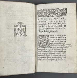 Dany, abbé de S. Crespin le Grand, de Soyssons, & grand archidiacre dudict Soyssons.... A Paris, chez Gervais Mallot, 1582. In-8, [15]-213-[7] f., velin ivore XIXe s., dos à 4 nerfs, pièces d'auteur et de titre veau havane, roulettes dorées (titre sali, puis très légères salissures ou traces de poussière). Ouvrage composé par le théologien franciscain espagnol Antonio de Guevara (1481-1545), évêque de Mondoñedo, chroniqueur de Charles I, et inquisiteur. Nouvelle édition de cette traduction française dont l'épitre dédicatoire et le privilège sont de 1577. Armes du dédicataire, le cardinal de Bourbon, Primat de Normandie, gravées sur bois au v° du titre. Ex-libris manuscrit ancien au titre, d'un carmel. Provenance : Jean Tremblot de La Croix (1893-1964), conservateur à la Bibliothèque de l'Institut de France, historien, héraldiste ; par descendance.