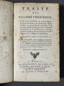 [Reliure aux armes]. HUNTER (John). Traité des maladies vénériennes... Traduit de l'anglois par M. Audiberti... A Paris, chez Méquignon, 1787. In-8, 32 p. (les 16 premières en romain), 430 p., [1] f. (approb.), pl, basane rouge époque, dos à 5...