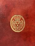 nerfs, pièce de titre fauve, caissons ornés du chiffre royal répété en fleurons, triple filet doré bordant les plats, armes royales dorées au centre, roulette dorée aux coupes et chasses, tranches jaspées (dos et plat sup. insolés, celui-ci avec qq. taches, mors frottés avec une fente en tête, rousseurs). Première édition en français, illustrée de 7 planches dépliantes gravées sur cuivre. Exemplaire aux armes et chiffre royaux.