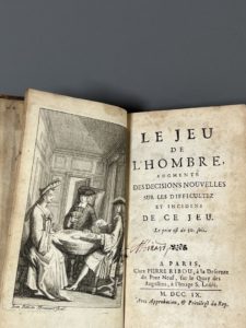 JEU DE L'HOMBRE (LE), augmenté de décisions nouvelles sur les difficultez et incidens de ce jeu. A Paris, chez Pierre Ribou, 1709. 2 parties en un volume in-12, [6] f., 166 p., [6] f., 33 p., [1] f., frontispice gravé sur cuivre par Bonnart, veau...
