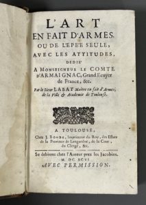 [Escrime]. LABAT (Jean). L'art en fait d'armes, ou de l'épée seule, avec les attitudes... A Toulouse, chez J. Boudé, 1696. In-8, [8] f., 173 p., [1] f., pl., basane havane époque, dos à nerfs orné, tranches jaspées (rel. usée, plats...
