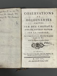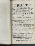 [Hippologie]. LAFOSSE (Philippe-Etienne). Observations et découvertes faites sur des chevaux, avec une nouvelle pratique sur la ferrure. Paris, Hochereau le jeune, 1754. [Relié à la suite] : Traité Sur le véritable siége de la morve des...