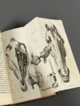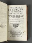 chevaux, et les moyens d'y remédier. Paris, David père, Gonichon, 1749. [Et] : Nouvelle pratique de ferrer les chevaux, Afin de les rendre fermes sur le pavé sec, de rétablir les mauvais pieds & conserver les jambes.... Paris, Desprez, Hochereau l'aîné, 1758. 3 ouvrages en un volume in-8, basane havane mouchetée époque, dos à 5 nerfs, pièce de titre fauve, tranches rouges (frottements ; accroc au 1er titre, salissures sans gravité, 1 planche en déficit). Ensemble de 3 ouvrages peu communs du vétérinaire P.-E. Lafosse (1738-1820) que l'on trouve le plus souvent réunis. 1. Observations... [1] f. (titre), 42 p., 2 planches dépliantes (sur 3, il mq. la pl. 1) ; la pl. 2 est coloriée. - 2. Traité... [4] f., 24 p., p.43-80, [1] f. (errata), 1 planche. (qq. mots soulignés p.23, déch. sans mq. p. 51). - Nouvelle pratique... [4] f., 95 p., 3 pl. (1 pl. usée en marge). Provenance : de Ribains, « ancien lieutenant colonel du 6ème Régiment des chasseurs à cheval » (mention ms., et signature au titre).