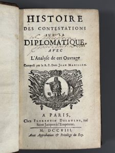 LALLEMANT (Jacques-Philippe). Histoire des contestations sur la diplomatique, avec l'analyse de cet ouvrage composé par le R.P. Dom Jean Mabillon. A Paris, chez Florentin Delaulne, 1708. In-12, [3] f., 322 p., [5] f., veau havane époque, dos à 5...