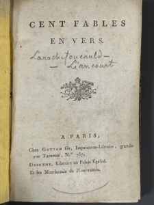 [LA ROCHEFOUCAULD-LIANCOURT (Frédéric Gaëtan de)]. Cent fables en vers. A Paris, chez Goujon fils, Desenne, et les marchands de nouveautés, [1800]. In-18, [2] f., 106 p., VIII p. (table), 5 p. (Psaphon), demi-basane noire époque, dos lisse,...
