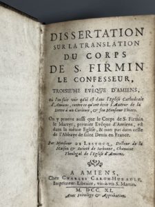 [Picardie]. LESTOCQ (Nicolas de). Dissertation sur la translation du corps de S. Firmin le Confesseur... où l'on fait voir qu'il est dans l'église cathédrale d'Amiens... On y prouve aussi que le corps de S. Firmin le Martyr, premier évêque...