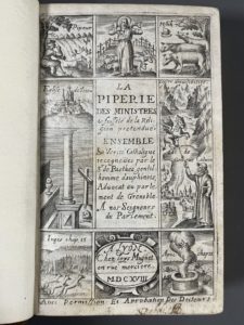 (titre gravé), [6] f., p.1-2, 7-682, [4 (sur 5)] f., demi-maroquin havane à coins, dos à 5 nerfs, auteur, titre, fleurons, lieu et date dorés, double filet à froid bordant les caissons, tranches dorées [Thomas] (3 f. en déficit). Rare édition originale de cet ouvrage anti-protestant, composé à Grenoble par le capucin Marcellin de Pont-de-Beauvoisin, mort en 1624, et publiée sous le pseudonyme du « Sieur de La Pasthée, gentilhomme dauphinois, advocat au Parlement de Grenoble ». Titre gravé illustré de 7 vignettes. Il manque les f. A2 et A3 (soit les pages 3 à 6 dans l'Avertissement), et le dernier f. 4R2 qui suit la fin de la table). Signature ancienne en marge du titre. Voir : L. Blasutto, Étude d'un écrit antiprotestant : la Piperie des Ministres... Mémoire de maîtrise, ENSSIB, 2009, qui replace l'ouvrage dans son contexte dauphinois. (Desgraves 2240).