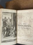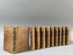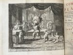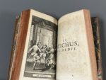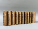 tranches rouges (qq. défauts d'usage dont 3 coiffes découvertes ; brunissures soutenues, rousseurs). Édition illustrée d'un frontispice dépliant, de 10 titres-frontispices, de 20 planches et d'un tableau dépliant, le tout gravé sur cuivre. On trouve à la fin du dernier volume les fragments de Plaute, la liste des « obscenitez », et un catalogue du libraire de 94 pages. Sur le faux-titre au tome premier figure adresse du distributeur détenteur du stock à la date de 1726, Henry Scheurleer, à La Haye.