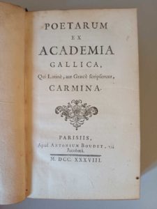 [Néo-latins]. POETARUM ex Academia Gallica, qui latinè, aut graecè scripserunt, carmina. Parisiis, apud A. Boudet, 1738. In-12, veau fauve époque, dos à nerfs (défauts dont mors sup. fendu, attache faible du plat sup., sans pièce de titre)....
