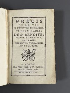 [Picardie. Hagiographie]. PRÉCIS DE LA VIE, de l'invention des reliques, et des miracles de Ste Benoite, vierge et martyre, patrone d'Origny en Vermandois et de l'abéie. A Noyon, chez J.-F. Devin, 1786. Petit in-8, 32 p., cart. marbré moderne,...