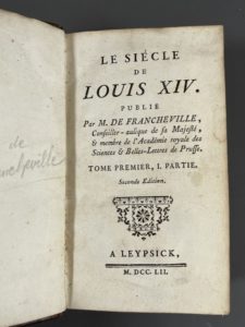 [VOLTAIRE]. Le siècle de Louis XIV. Publié par M. de Francheville... Seconde édition...A Leypsick, s.n., 1752. 2 tomes en 4 parties, en 2 vol. in-12, [4] f., 239 p. ; [2] f., 323 p. + [2] f., 238 p. ; [2] f., 316 p., veau havane marbré époque,...