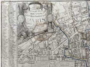 dont mouillures, traces de plis). Plan bordé d'une importante liste alphabétique des rues, et comprenant 2 cartons : un petit « Projet pour la place d'une salle d'opéra à Paris », et une carte du département de la Seine.