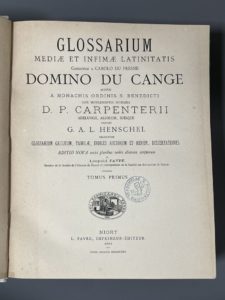 DU CANGE (Charles Du Fresne). Glossarium mediae et infimae latinitatis.... Editio nova aucta pluribus verbis aliorum scriptorum a Léopold Favre... Niort, Favre, 1883-1887. 10 volumes in-4, demi-toile gris clair moderne, pièces de titre basane bleue...