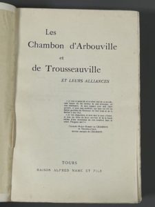 [Généalogie]. CHAMBON D'ARBOUVILLE (LES) et de Trousseauville et leurs alliances. Tours, Mame, [1925]. In-8, 231 p., 7 portraits h.-t., 24 tableaux généal. dépl. h.-t., fig. d'armoiries dans le texte, broché (dos passé). Provenance : Jean...