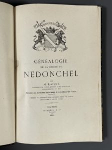 [Généalogie]. LAISNÉ. Généalogie de la maison de Nedonchel... Tournai, Leclercq, 1895. In-8, 185 p., fig., pl., demi-basane brune racinée, dos lisse orné, auteur et titre dorés (qq. ff. jaunis). Edition corrigée et augmentée de « documents...