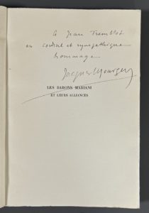 [Généalogie]. MEURGEY DE TUPIGNY (Jacques). Les barons Mariani et leurs alliances. Nogent-le-Rotrou, Impr. Daupeley-Gouverneur, 1933. Grand in-8, tabl. dépl. h.-t., planches, broché. Envoi autographe signé de l'auteur à Jean Tremblot de La...