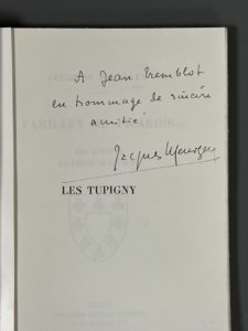 [Généalogie]. MEURGEY DE TUPIGNY (Jacques). Familles de Picardie. Les Tupigny et leurs alliances. P., Saffroy, 1935. In-8, XII-110 p., 8 planches, broché. Envoi autographe signé de l'auteur à Jean Tremblot de La Croix. Provenance : Jean Tremblot...