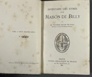 [Généalogie]. POLI (Oscar de). Inventaire des titres de la maison de Billy. Paris, Conseil héraldique de France, 1894. In-12, XLV-300 p., [1] f. (errata), pl., demi-chagrin bleu, dos à 5 nerfs, pièces de titre et d'auteur fauve, fleurons...