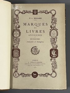 [Ex-libris. Bibliophilie]. BOULAND (L.). Marques de livres anciennes et modernes françaises et étrangères. Paris, Giraud-Badin, 1925. In-8, VIII-517 p., fig., demi-basane fauve mouchetée époque, dos à 5 nerfs, titre doré. Ouvrage illustré de...