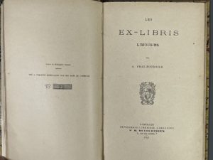 [Ex-libris. Bibliophilie]. [Limousin]. FRAY-FOURNIER (A.). Les ex-libris limousins. Limoges, Ducourtieux, 1895. In-8, 62 p., fig., cart. marbré à la Bradel, pièce de titre en long au dos (lég. frott.). Extrait du Bibliophile limousin tiré à 50...