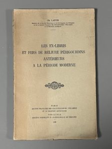 [Ex-libris. Bibliophilie]. [Périgord]. LAFON (Ch.). Les ex-libris et fers de reliure périgourdins antérieurs à la période moderne. Paris, Soc. Fr. des Collectionneurs d'Ex-libris, 1936. Grand in-8, broché (couv. et dos brunis). Provenance :...