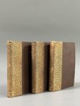 demi-basane fauve façon peau de serpent, dos lisse, auteur et titre dorés, tête dorée, couv. conservées (lég. frott. petites griff. sur un plat inf. ; rousseurs au vol.2). Bel exemplaire des trois volumes de cette série réalisée par G. Auriol (1863-1938), poète, graphiste et concepteur de caractères typographiques. Tiré sur papier vergé. Provenance : les deux premiers volumes ont été offerts par l'auteur au célèbre bibliophile Octave Uzanne (1851-1931), avec au vol. 1, un envoi autographe signé illustré d'un petit motif floral peint, et au vol. 2, un bel envoi poétique, « à Octave Uzanne qui fréquente l'agave et tutoie la cigale... » peint en plusieurs couleurs (en partie délavé et bruni). Provenance : Jean Tremblot de La Croix (1893-1964), conservateur à la Bibliothèque de l'Institut de France, historien, héraldiste ; par descendance.