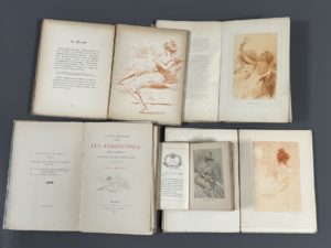 Carnet d'un Suiveur. IV. Les Petits Métiers. V. Les Nuits de Paris. VI. Toutes les Bohêmes. Chaque volume est illustré de 4 eaux-fortes originales d'Henri Boutet, soit 24 planches. 2. PETIT ALMANACH. Première, deuxième et troisième années. Paris, 1893, 1894, 1895. 3 volumes in-18 (un vol. débroché). Illustrations dans le texte. 3. LES HEURES de la Parisienne. Almanach pour 1899. In-18 (débroché). 12 eaux-fortes en couleurs h.-t. ; et figures dans le texte. 1/1000 vélin. 4. MONTORGUEIL. Les Parisiennes d'à présent. P., Floury, 1897. In-12 (débroché). Illustr. en couleurs dans le texte. 1/750 vélin. 5. MONTORGUEIL. Les déshabillés au théâtre. P., Floury, 1896. In-12 (débroché). 8 eaux-fortes hors-texte ; figures dans le texte. 6. BOUTET. Autour d'elles. Le lever. Le coucher. P., Ollendorff, 1899. In-12 (débroché). Illustr. en sépia à pleine page. 7. COURTRY. Boutet embêté par Courtry. P., Bibl. artistique et litt., 1896. In-12 (débroché). 3 planches gravées, ill. dans le texte. 1/350 vélin. Soit 14 volumes.