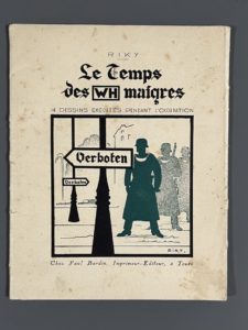 [Caricature]. RIKY (pseud de H.-R. Boutigny). Le temps des WH maigres. 14 dessins exécutés pendant l'Occupation. Tours, Bardin, [1945]. In-8, en feuilles sous couverture éditeur illustrée (rouss. sur la couv.). 14 dessins sur 12 planches dont 3...
