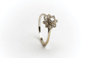 750 millièmes, le centre à décor de fleurette serti de neuf diamants ronds de taille brillant, celui du centre plus important de taille ancienne.