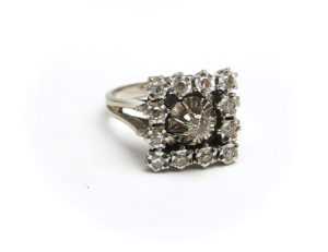 750 millièmes, le centre de forme carrée orné de diamants ronds taillés en huit-huit, un légèrement plus important de taille