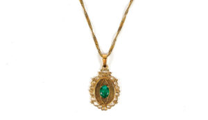 750 millièmes retenant un pendentif en or jaune 750 millièmes ajouré orné d'une pierre verte.
