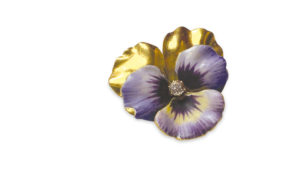 750 millièmes figurant une pensée, certains pétales émaillés en polychromie, le cœur serti d'un diamant rond de taille ancienne.