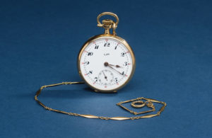 750 millièmes retenant une montre de poche en or jaune 750 millièmes, le fond gravé à décor rayonnant, cadran émaillé blanc, chiffres arabes pour les heures, chemin de fer pour les minutes, trotteuse à six heures.