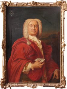 Huile sur toile, 99 x 70. Dans un cadre récent orné doré (petits accidents au seul cadre). En costume avec cape rouge, et perruque, il tient dans sa main droite une lettre portant : «A Monsieur, Mons. Michel Libert Mayeur et Echevin de Goreux et Roloux. Hesbaye, Liége». Armes en haut à gauche. Peinture en bonne condition.