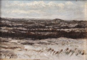 Huile sur panneau, 15,5 x 23,5. Titrée et datée «Harlem. 27.12.77» en bas à gauche. Dans un cadre noir (petits accidents au cadre). Actuellement Haarlem, cette ville est la capitale de la province de Hollande septentrionale, aux Pays-Bas. Joint : Anonyme. Paysage à Callantsoog. 1877. Huile sur panneau, 15,5 x 24. Titrée et datée «Callantsoog. 10.12.77» en bas à droite. Dans un cadre noir (petits accidents au cadre). Petite station balnéaire située dans le nord des Pays-Bas.
