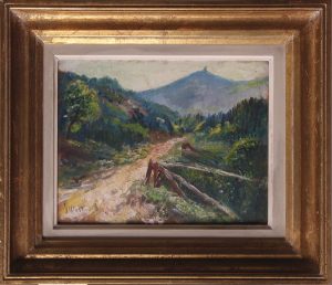 Huile sur panneau, 21 x 27. Signé «G. Halbart» en bas à gauche. Dans un cadre doré. Peintre de paysages, scènes de genre, aquafortiste, etc., né à Rocourt en 1846 et mort à Visé en 1913. Il voyagea en Italie et en Afrique du Nord. Il fut un des précurseurs de l’impressionnisme belge (Arto).