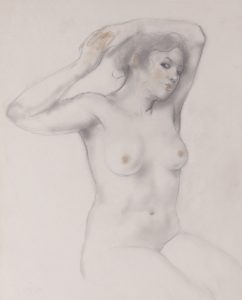 Dessin au crayon rehaussé, sur papier vélin 37 x 28. Cachet d’atelier rouge en haut à droite. Pièce en très belle condition. Le modèle tient pose les mains à plat et penche sa tête vers sa droite.